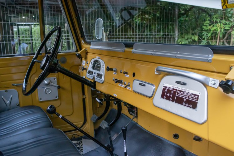 Repainted in the original yellow color, this FJ45 is rust free and filler free. The badges are original and restored, including the grill surround. The frame and undercarriage are also rust free, and have been refurbished and repainted. The driveshafts, transfer case and rear differential were fully rebuilt, and the clutch was replaced.