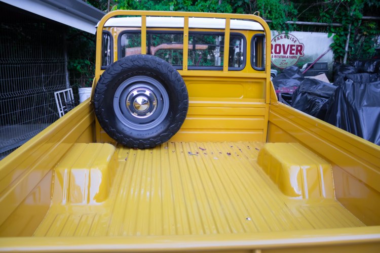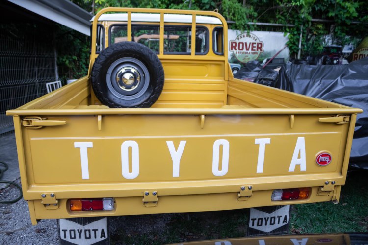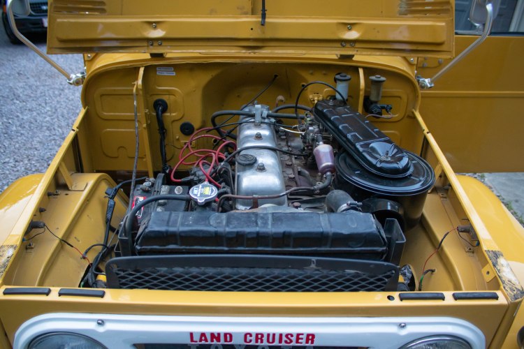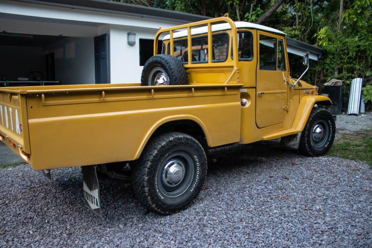 The Toyota Land Cruiser FJ45 is closely related to the FJ40, but has a longer wheel base to allow for the truck bed. This particular FJ is powered by a 3.9 liter inline 6 gasoline engine, paired with a 3-speed manual transmission. The body was fully repainted in the original yellow color, inside and out.