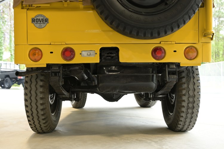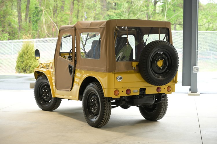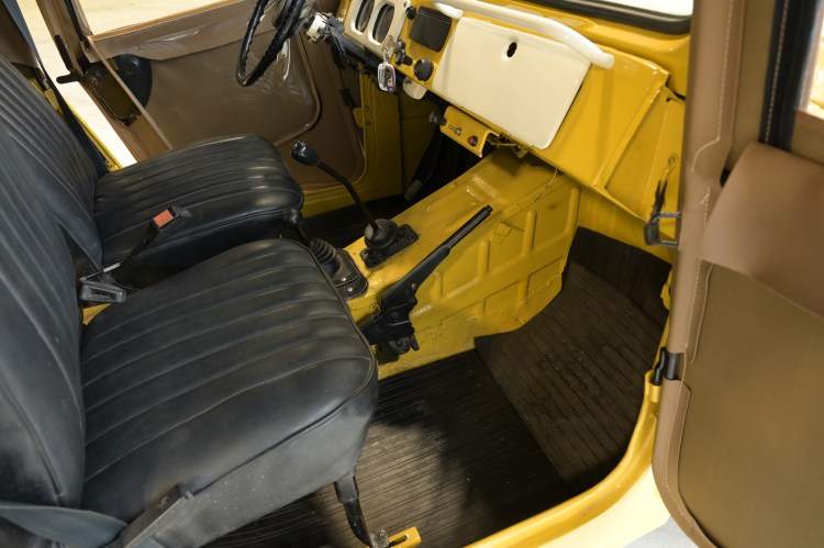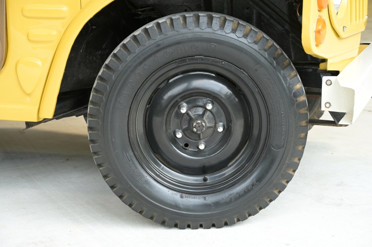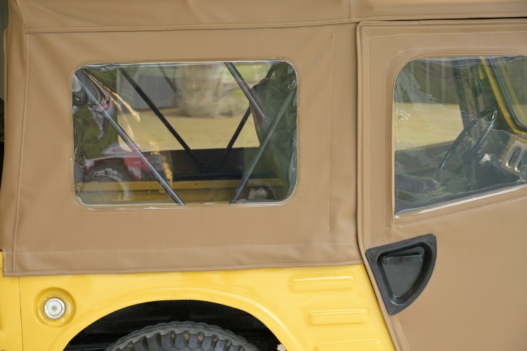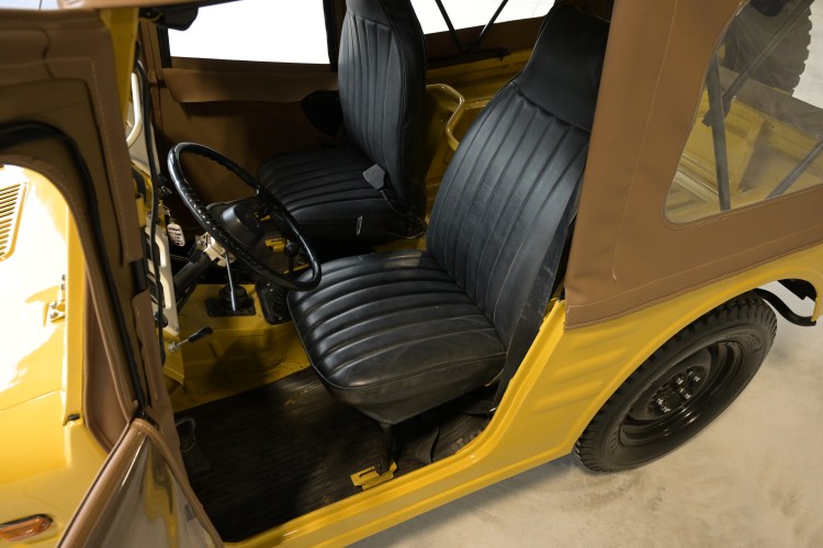 The interior features black leather seats with new rubber floor mats in the driver and passenger floorboards. The new tan colored soft-top is a marine grade fireproof. A two spoke steering wheel fronts a 120-kmph speedometer and auxiliary gauges.