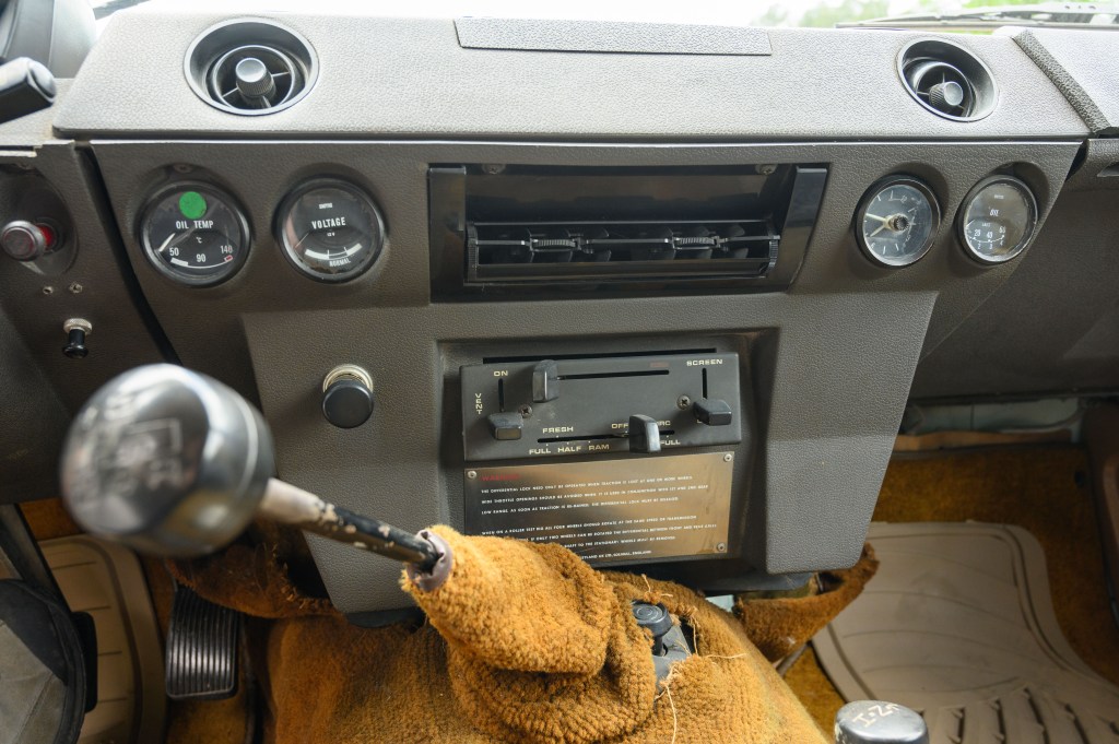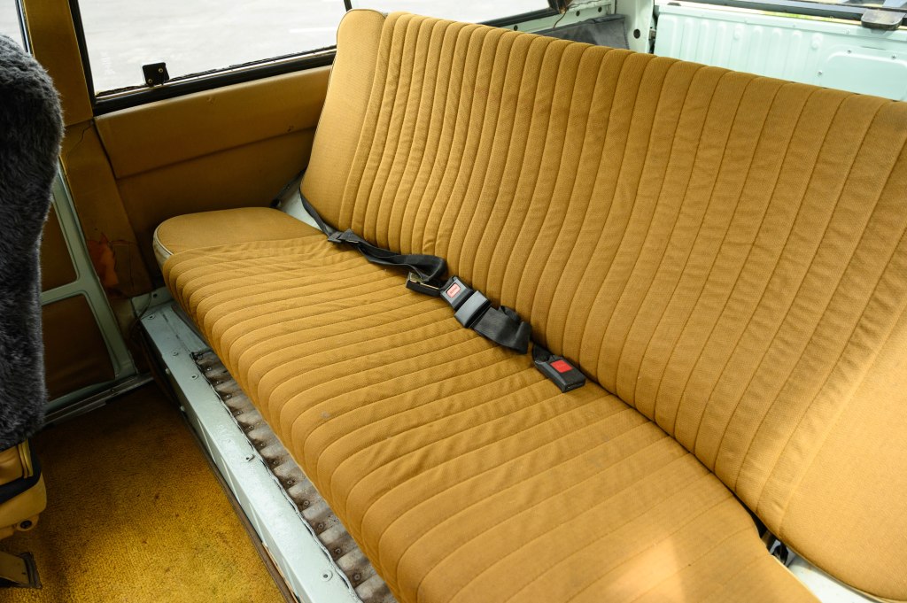 The interior is outfitted with accessory sheepskin seats, an aftermarket radio and the first ever clock in any Land Rover. The original documents can be found in the glove box. Original tools with the wood hand crank can be found in the rear cargo area across from the spare with the original cover.