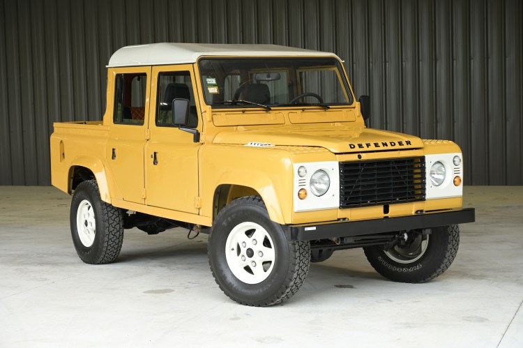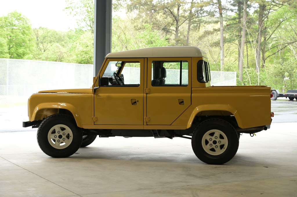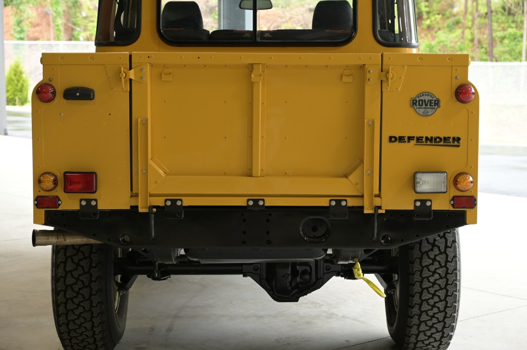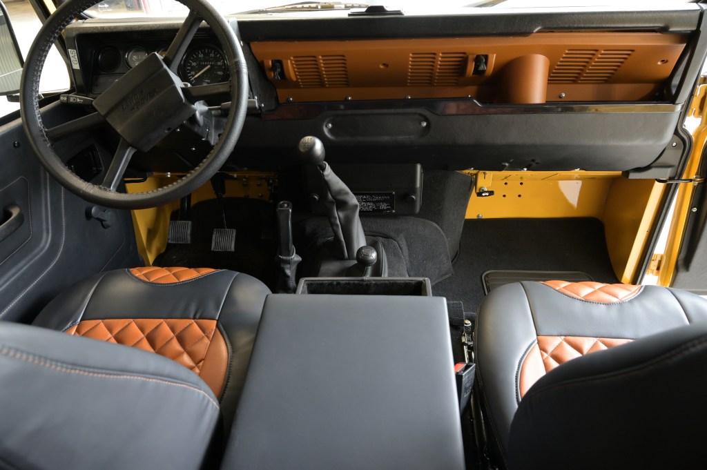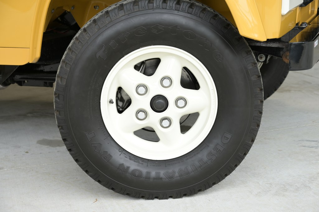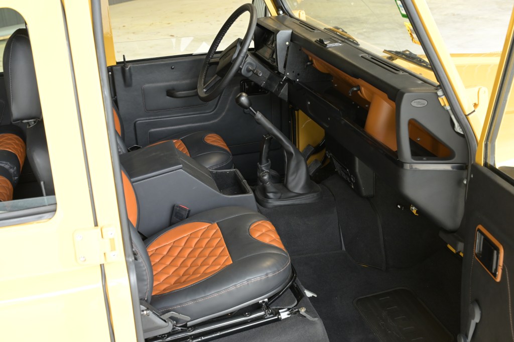 This 1986 Land Rover Defender is finished in yellow with tangerine and gray leather seats and interior. The Rover is powered by a 3.5L V8 gas motor paired with a five-speed manual transmission. Features include original 16 inch wheels and Firestone Destination RVT tires.