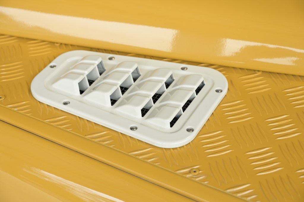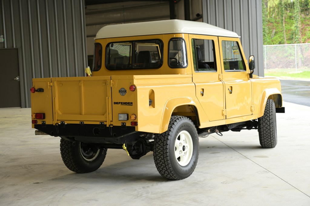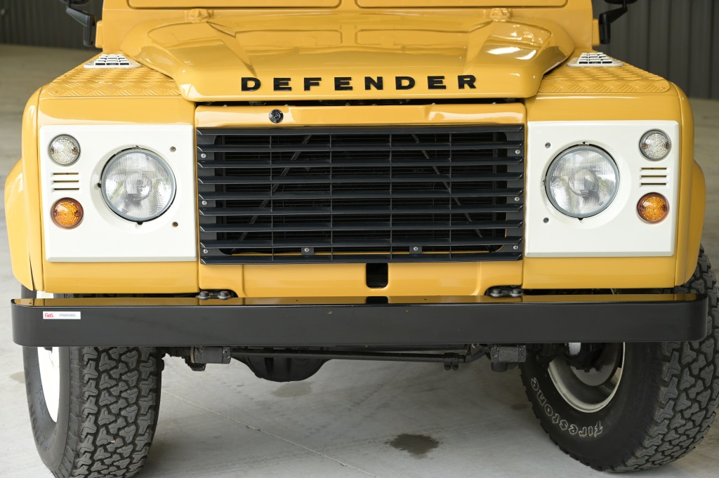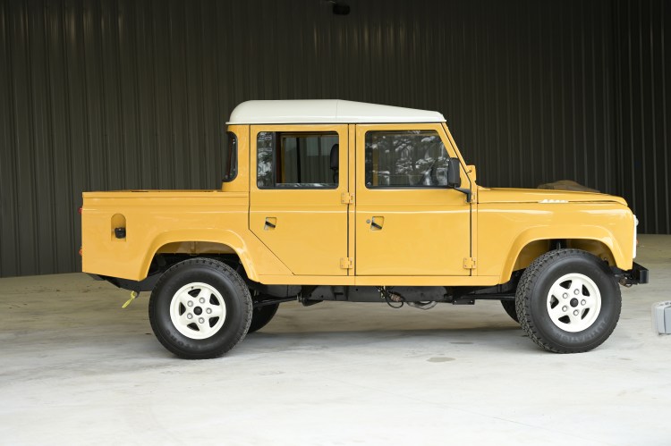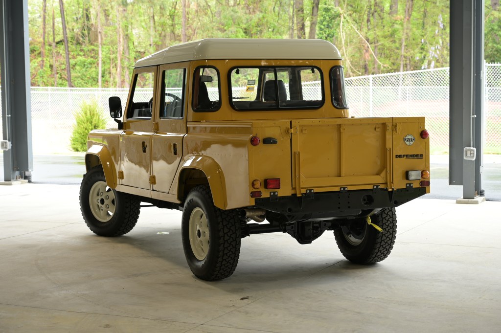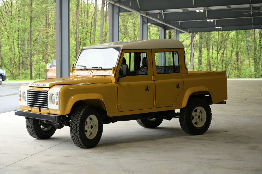 This 1986 Land Rover Defender is finished in yellow with tangerine and gray leather seats and interior. The Rover is powered by a 3.5L V8 gas motor paired with a five-speed manual transmission. Features include original 16 inch wheels and Firestone Destination RVT tires.