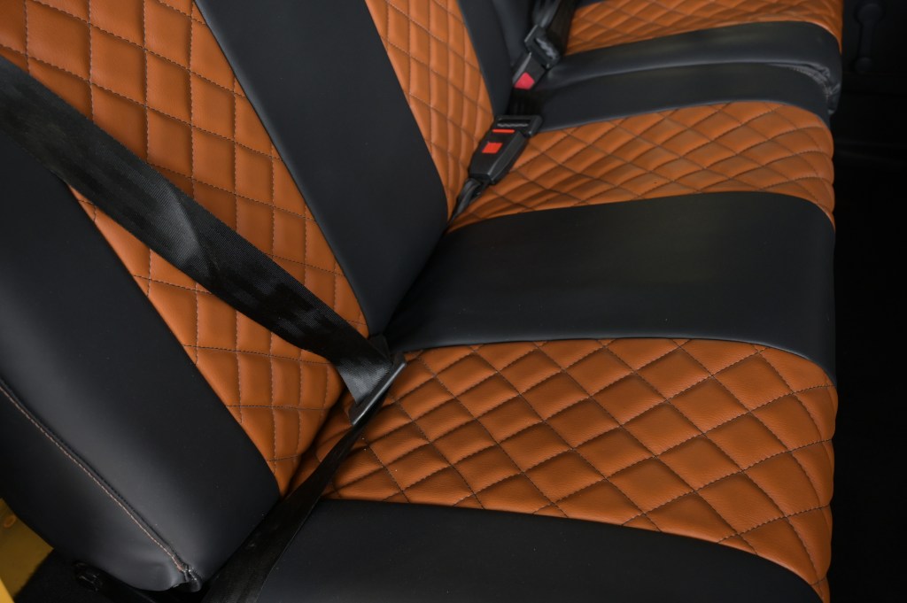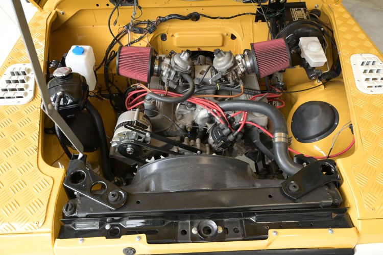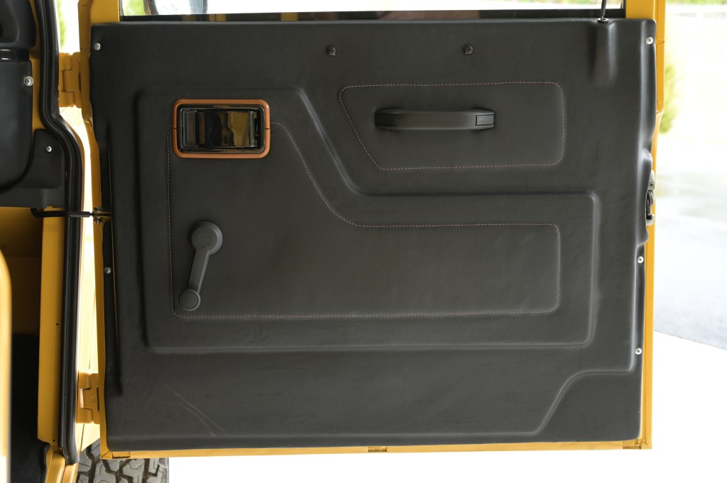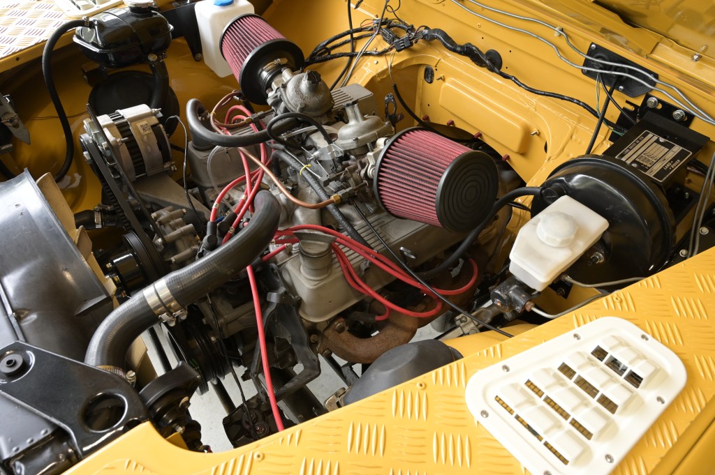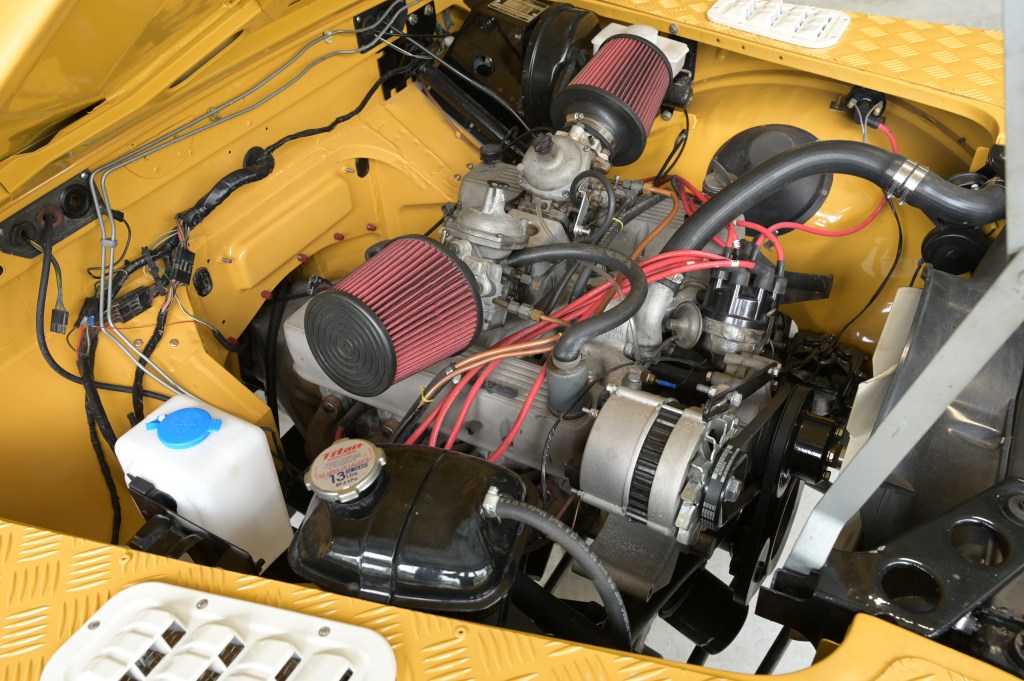 The cabin features tangerine and gray leather seats with tangerine details continuing on the dash, door panels and sun visors, as well as the B and C pillars. The interior carpet has all been replaced with new OEM style carpet. A four spoke steering wheel fronts a 120-mph speedometer and auxiliary gauges. 275/75R16 Firestone Destination RVT tires were recently installed. The six-digit mechanical odometer shows 164,560 miles. The 3500cc motor includes a new carburetor, fuel pump and filter, spark plugs and ignition wires and starter.
